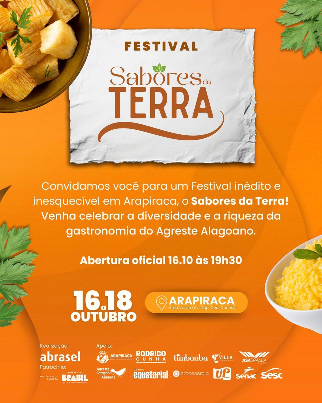 O Festival Sabores da Terra conta com o patrocínio do Ministério da Cultura, Governo de Alagoas, Grupo Equatorial, Echoenergia, e apoio de Rodrigo Cunha, Agreste Coração Alagoas, Timbaúba, Villa, Asabranca, Senac e Sesc.