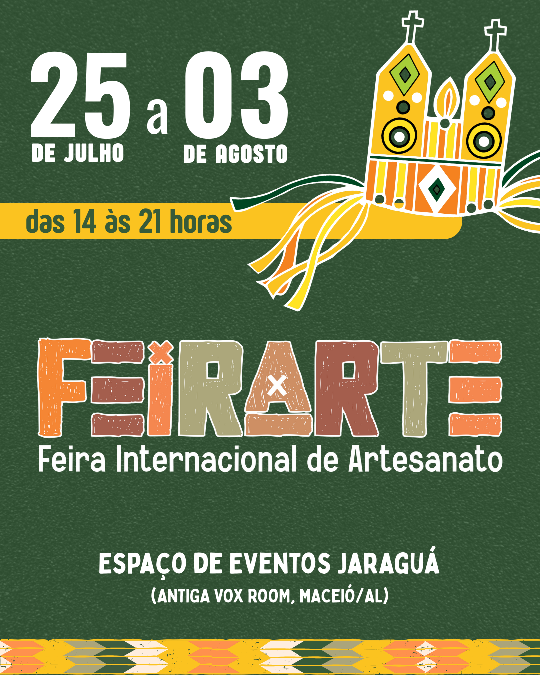AFeira Internacional de Artesanato (Feirarte) iniciará nesta sexta (25) no Espaço de Eventos Jaraguá (antiga Vox Room) e segue até o dia 03 de agosto, das 14h às 21h, destacando Alagoas em sua programação e estandes. Com preço acessível, o evento é uma oportunidade de lazer e entretenimento na qual os visitantes também poderão conhecer culturas de outros lugares e valorizar folguedos locais.