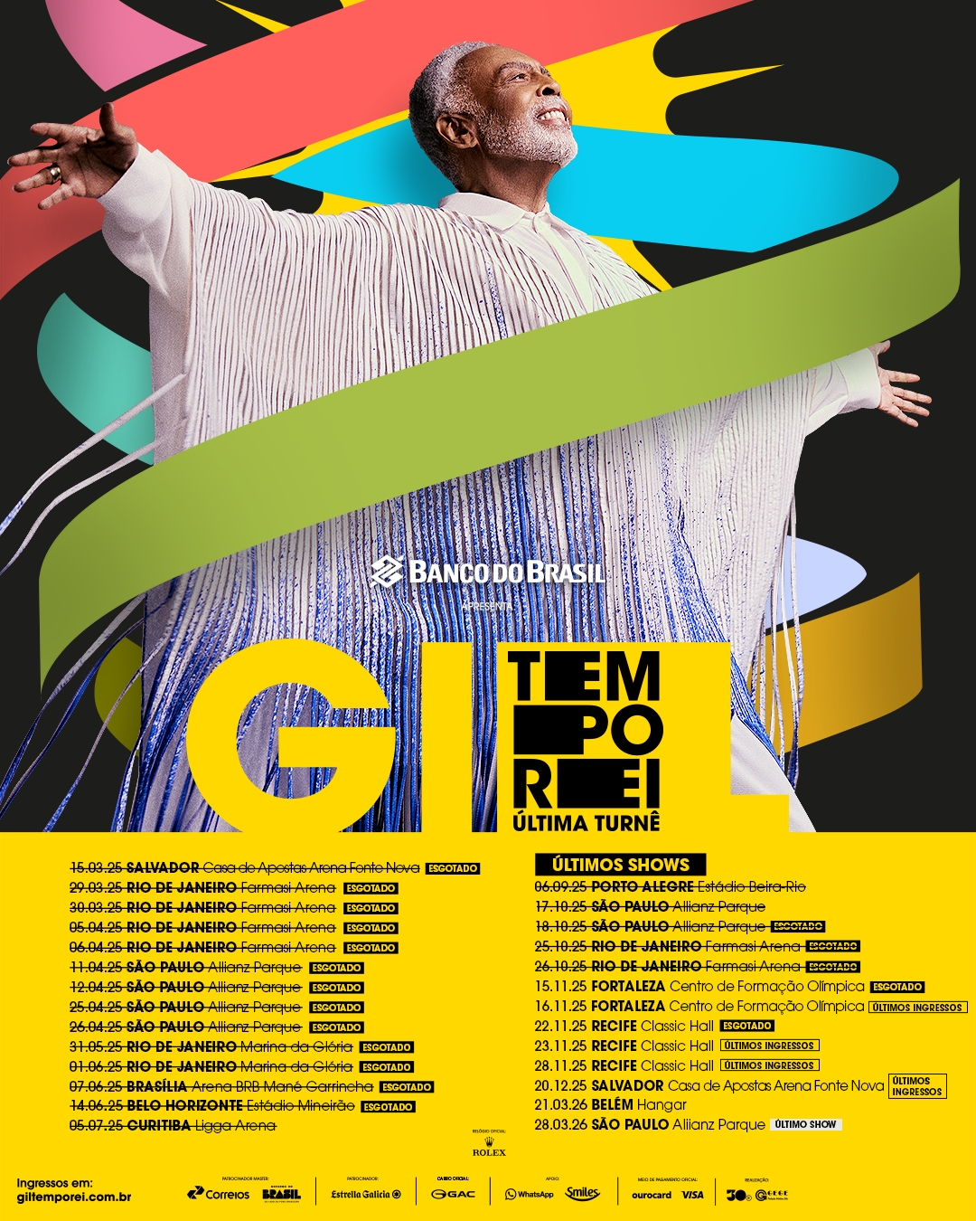 Gilberto Gil - TEMPO REI, a última turnêRealização: 30e e Gege Produções ArtísticasApresentado por: Banco do BrasilPatrocínios: Correios, Rolex e Estrella GaliciaApoio: WhatsApp, Smiles e GAC