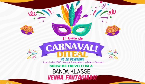 A Diretoria de Teatros do Estado de Alagoas (Diteal) promove, no dia 11 de fevereiro, a partir das 17h, o 1º Grito de Carnaval Diteal, evento especial para celebrar a alegria, a cultura e o espírito carnavalesco.