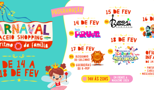 E se a ideia é curtir a folia, o Maceió Shopping também é o lugar certo! Prepare sua fantasia, o confete e a serpentina porque a folia de momo já está garantida! De 14 até 18 de fevereiro, a praça de eventos, localizada perto da loja Renner, será o palco da alegria, com uma programação especial de carnaval voltada para crianças e adultos.