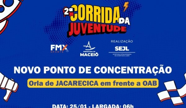 A Secretaria Extraordinária de Juventude e Lazer (SEJL) alterou o local de largada da 2ª Corrida da Juventude, marcada para o dia 25 de janeiro, com início às 6h da manhã. O novo ponto de concentração e largada será na orla de Jacarecica, em frente à OAB.