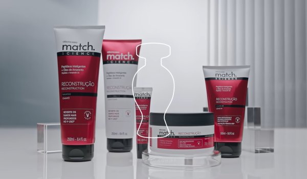 A linha Match Science Reconstrução é composta por shampoo, condicionador, máscara de tratamento, dose reconstrutora e leave-in. Todos os itens contam com dois principais ativos responsáveis pela reestruturação dos fios: o óleo de amaranto, potente na hidratação e nutrição, e os peptídeos inteligentes, provenientes da proteína do trigo e aprimorados em laboratório para agir diretamente na área danificada. Essa combinação proporciona tratamento intensivo nas áreas que precisam de intervenção.