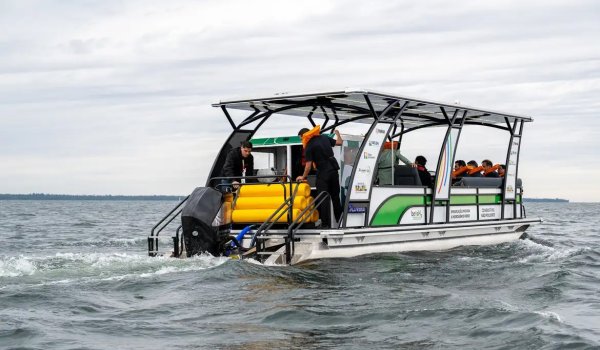 A embarcação também conta com sistema para aproveitar energia solar e, durante a navegação, não emite barulho nem poluentes. O único resíduo do motor é água pura.