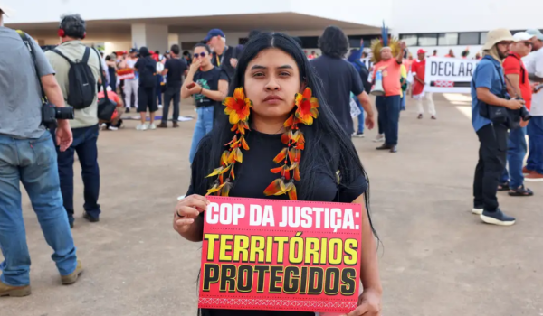 Enfrentar as mudanças do clima é ainda mais difícil quando não há sequer segurança no lugar em que se vive. Ela estava entre os cerca de 200 representantes de povos indígenas de todo o país que realizaram um evento nesta segunda-feira (13), em Brasília, pedindo a regularização de terras.