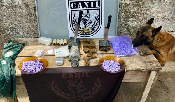 Durante as buscas no local, o cão farejador Bereta apontou para uma sacola abandonada, onde foram encontrados aproximadamente 850 gramas de maconha, divididos em barras e porções menores, além de 199 pinos de cocaína, diversos sacos plásticos, pinos vazios e uma balança de precisão. Todo o material foi apreendido e encaminhado à Central de Polícia Civil.