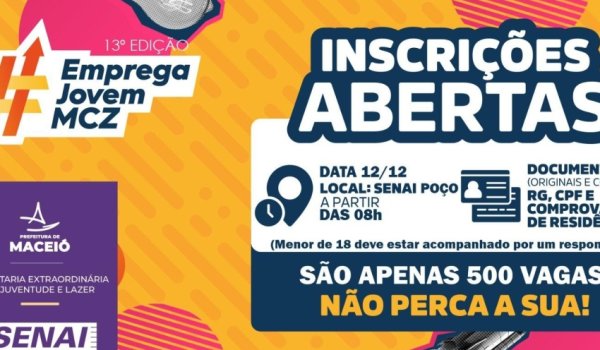 A Prefeitura de Maceió, em parceria com o Senai, abre nesta sexta-feira (12) as inscrições para a 13ª edição do Programa Emprega Jovem. A iniciativa é coordenada pela Secretaria Extraordinária da Juventude e Lazer (SEJL) e oferece 500 vagas em cursos gratuitos voltados à formação e qualificação profissional de jovens e adultos maceioenses, ampliando as oportunidades de inserção no mercado de trabalho.