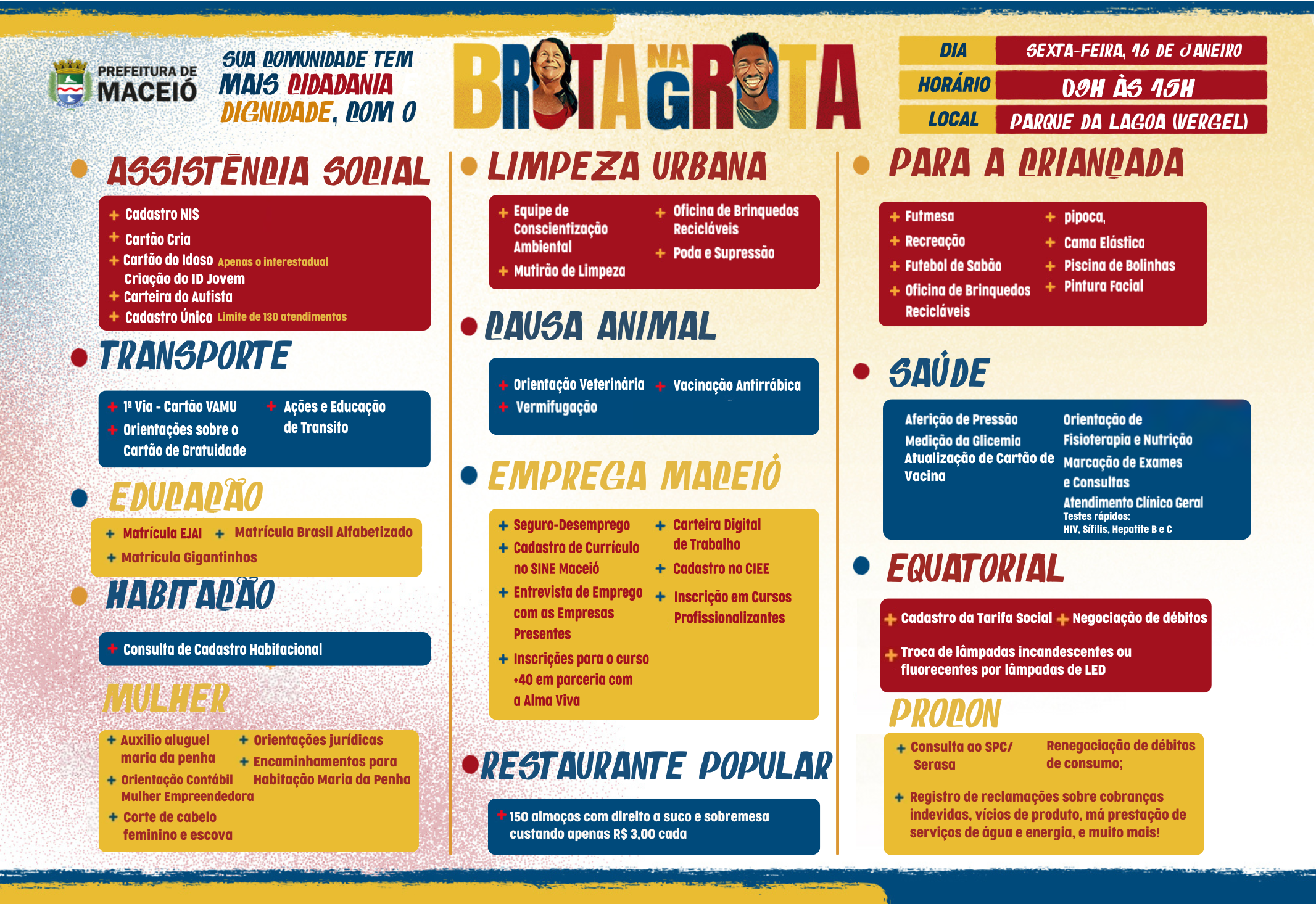 Nesta sexta-feira (16), a Prefeitura de Maceió realiza mais uma edição do programa Brota na Grota, agora no Parque da Lagoa, localizado no bairro do Vergel do lago ao lado do Campo do Botinha, das 9h às 15h. A ação oferece diversos serviços gratuitos, levando cidadania, inclusão social e inovação aos moradores da região.