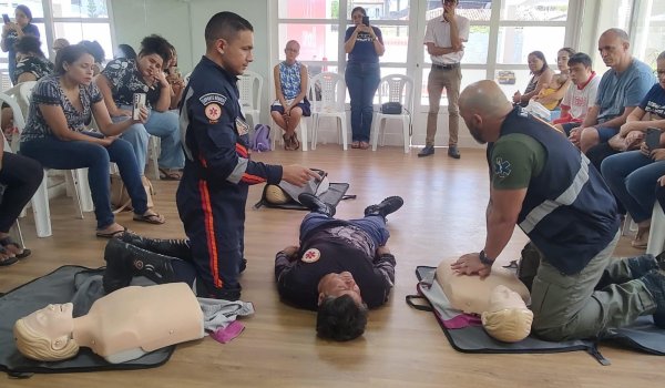 Os instrutores também apresentaram o tema Parada Cardiorrespiratória, que é a ausência de resposta a estímulos e a falta de respiração normal indicam parada cardiorrespiratória. Nesse caso, é fundamental acionar imediatamente o Samu 192 e iniciar compressões torácicas no centro do peito, com frequência de 100 a 120 movimentos por minuto.