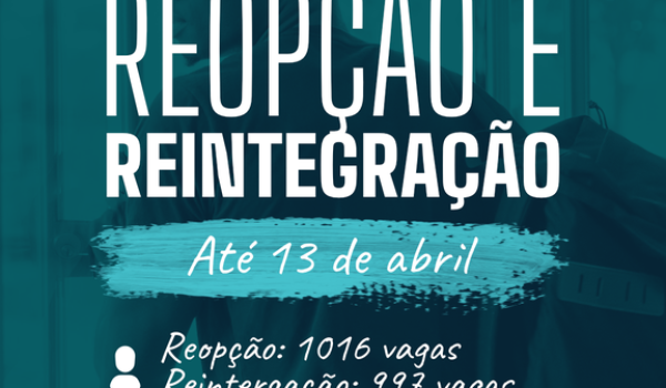 Já o processo seletivo de reintegração disponibiliza 997 vagas e é destinado a estudantes que tiveram o vínculo com a universidade cancelado há, no máximo, dez anos. Para participar, é necessário ter concluído pelo menos 50% da carga horária do curso de origem. Diferentemente da reopção, a seleção exige o pagamento de taxa de inscrição no valor de R$ 50, com possibilidade de isenção para candidatos que atendam aos critérios socioeconômicos estabelecidos em edital. Assim como na reopção, as inscrições para reintegração também seguem até o dia 13 de abril.