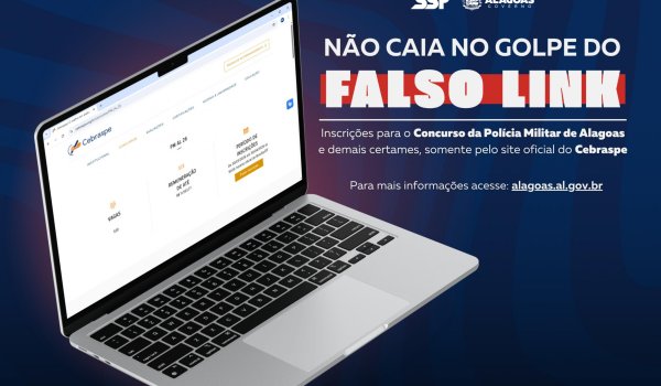 A Secretaria de Estado da Segurança Pública de Alagoas (SSP/AL) alerta para a circulação de links falsos de inscrição no concurso da Polícia Militar de Alagoas, que será realizado este ano. As informações foram repassadas por meio do Disque Denúncia 181 e encaminhadas à Polícia Civil, que investigará o caso.